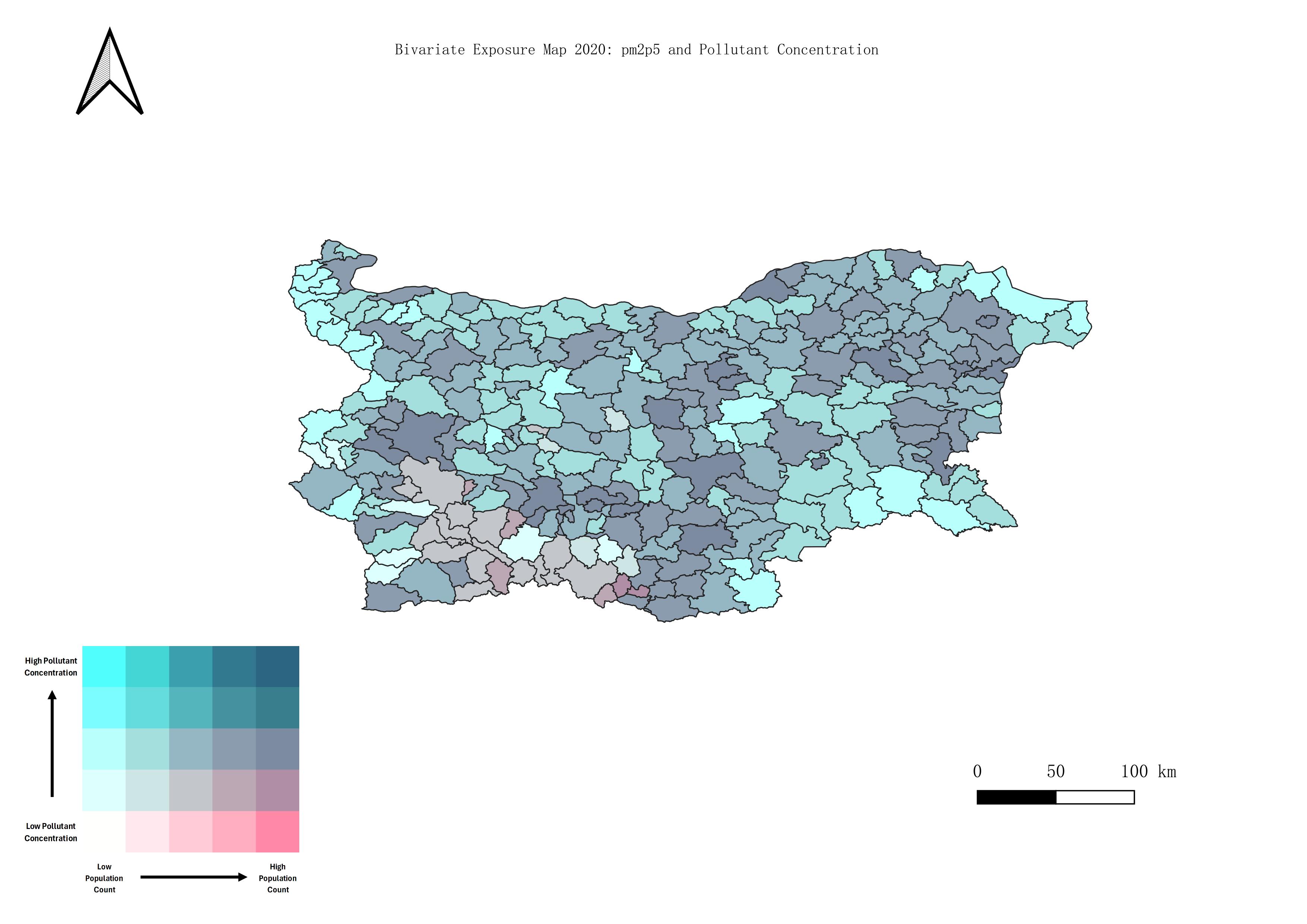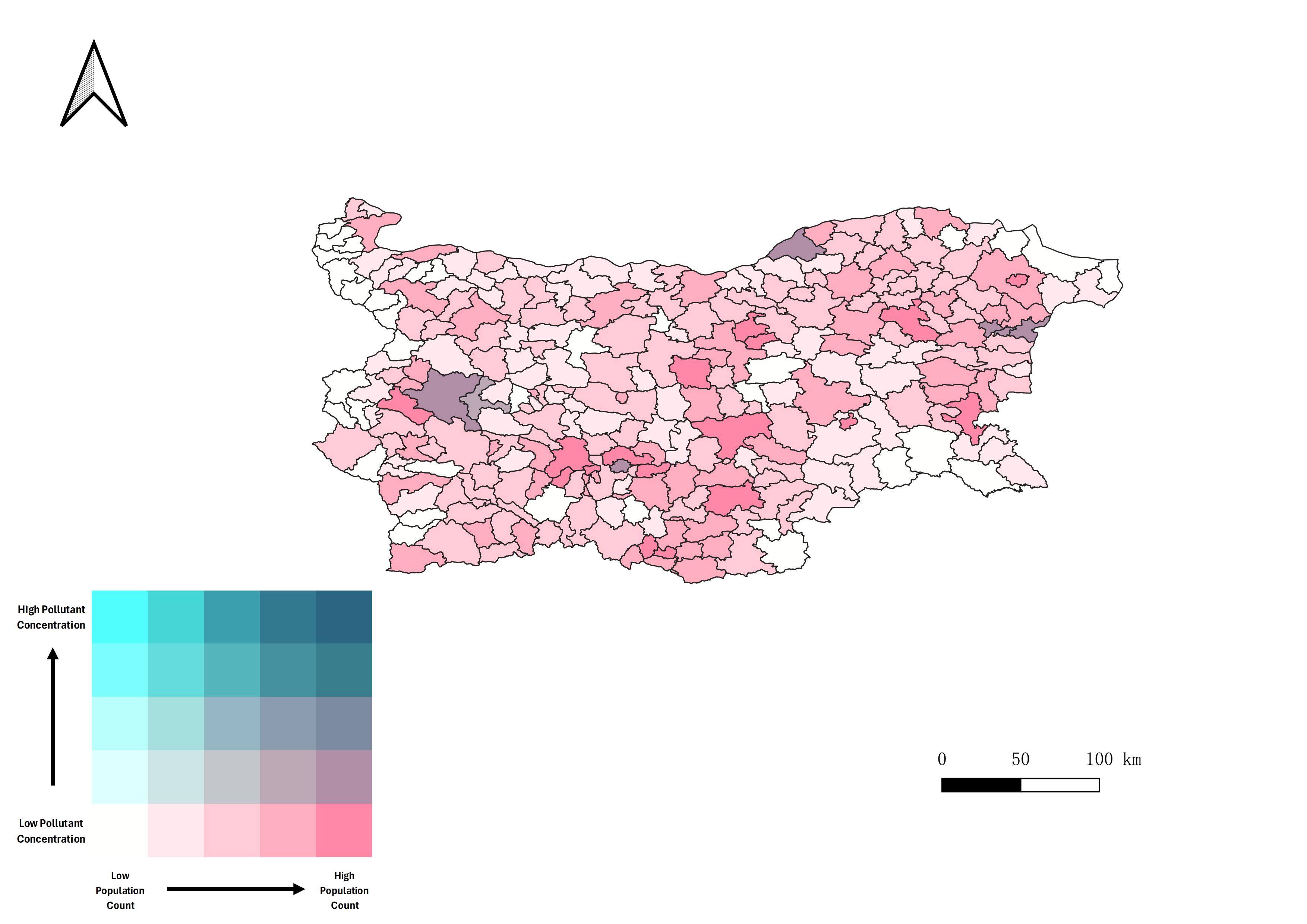 Based on the bivariate maps of pollutants, we can well reveal their spatial patterns, especially the degree of their air pollution is somewhat positively correlated with human economic activities. Sofia, the capital region of Bulgaria, is a highly polluted and densely populated area.