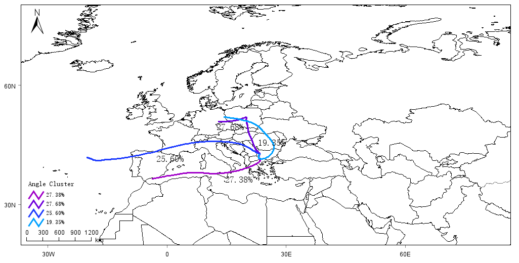 The analysis shows the results of clustering of the source paths of air masses based on Sofia (the capital of Bulgaria) as a receiving point, calculated by backward trajectory analysis of multiyear meteorological data (e.g., possibly using the HYSPLIT model). The different colored curves represent different Angle Clusters, where each type of path indicates the typical direction of air mass transport from the source region to Sofia and its probability of occurrence on a given time scale.